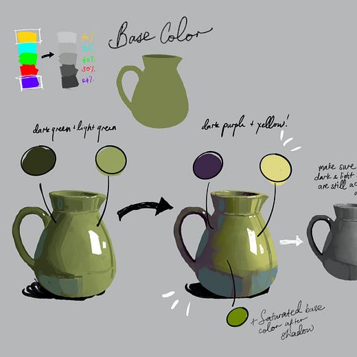 In Frozensoba’s example, shading purely with darker and lighter values is fine. I’d look at the green pot and think, “That’s nice”. But blending colors that are naturally brighter or darker adds a whole new dimension. The pot with purple and yellow comes to life.